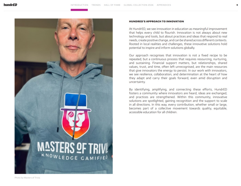 HundrED recognition is positioned as third-party validation for the project’s approach to education and scalable distribution. Selection for the Global Collection 2026 places Masters of Trivia among innovations highlighted for potential reach and applicability across diverse learning contexts.